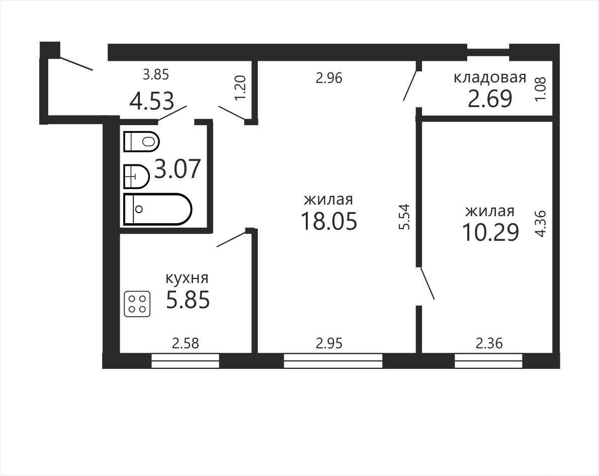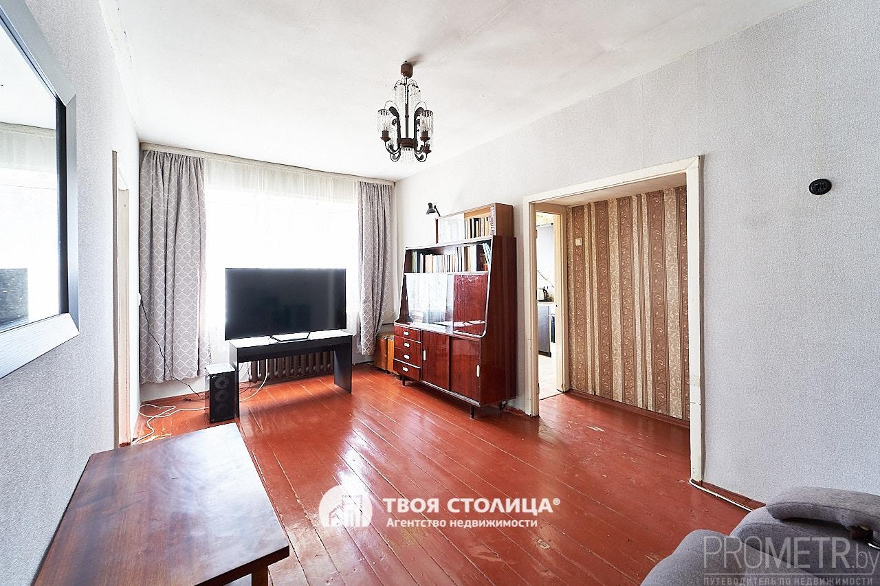 Квартира расположена на высоком первом этаже. Общая площадь 44.48 м2, жилая площадь 31.03 м2, кухня 5.85 м2.