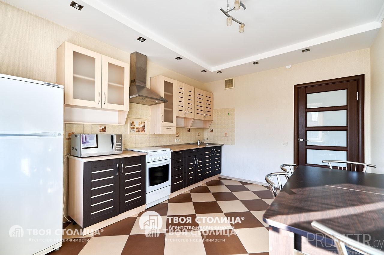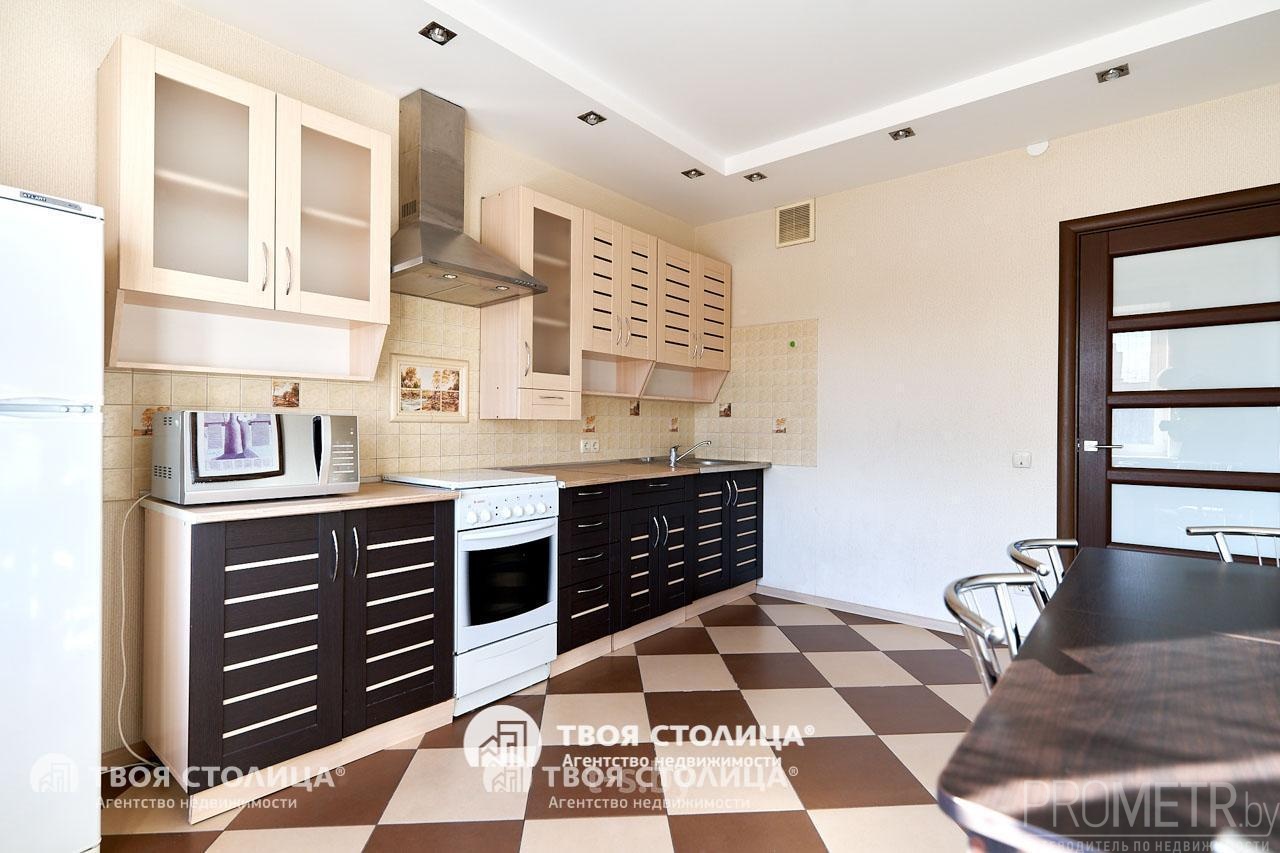 Интерьер выполнен в светлых пастельных тонах, что визуально увеличивает пространство. Напольные покрытия — ламинат и плитка. Установлены точечные и подвесные светильники. Кухня оборудована мебелью.