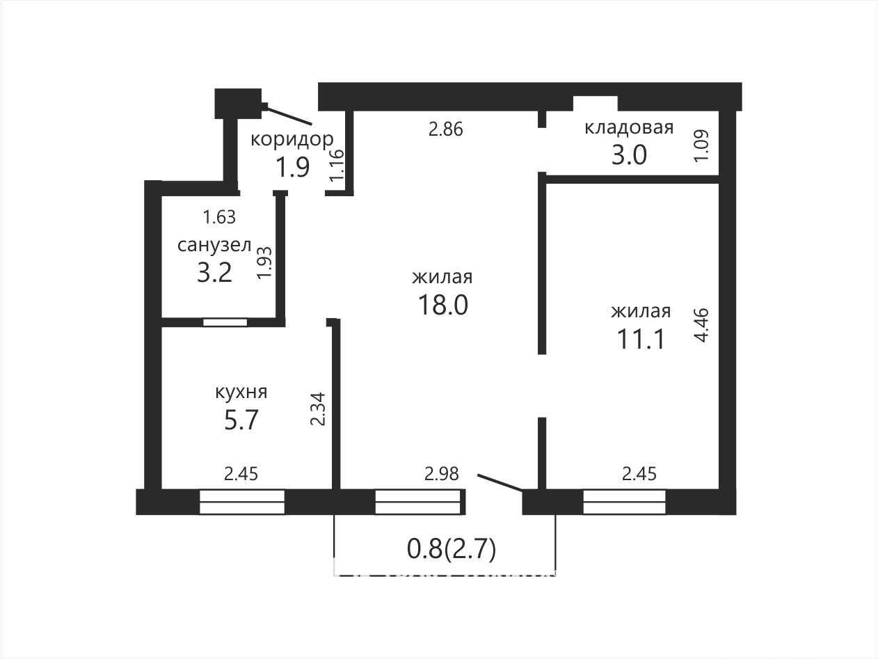 Площадь: общая — 42,9 м², жилая — 32,1 м², кухня — 5,7 м². Высота потолков — 2,54 м.