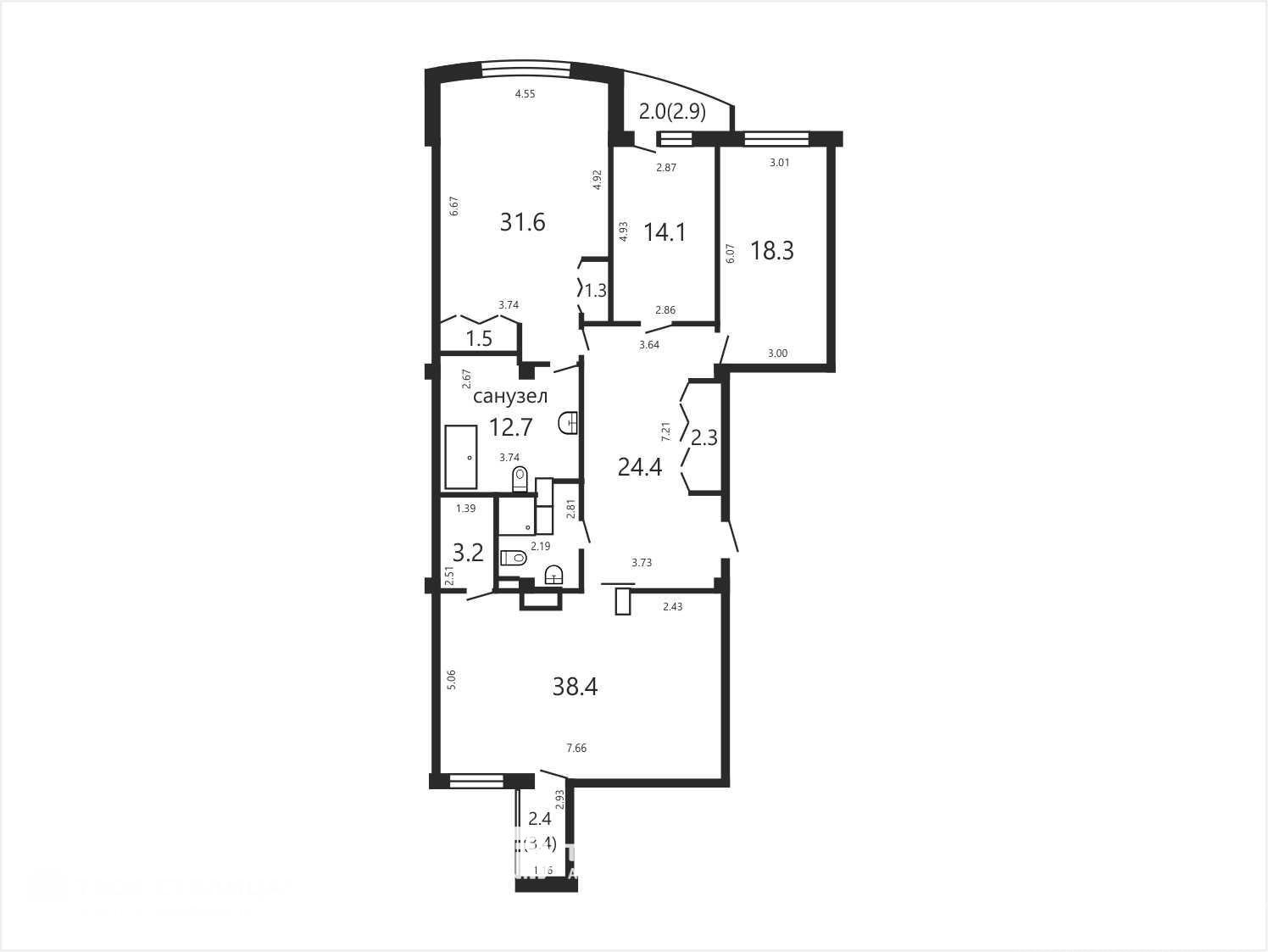 — планировка квартиры включает просторную гостиную с кухней площадью 38.4, три спальни, два санузла;