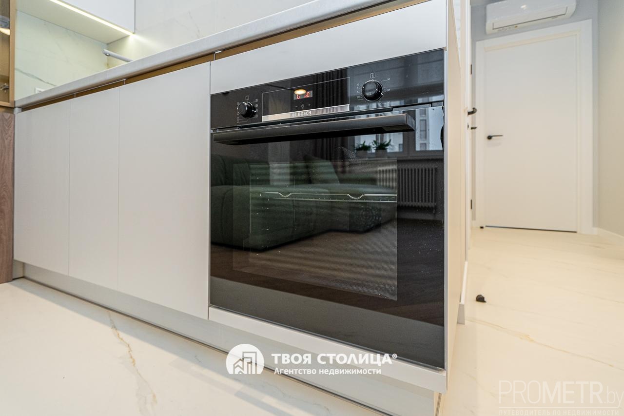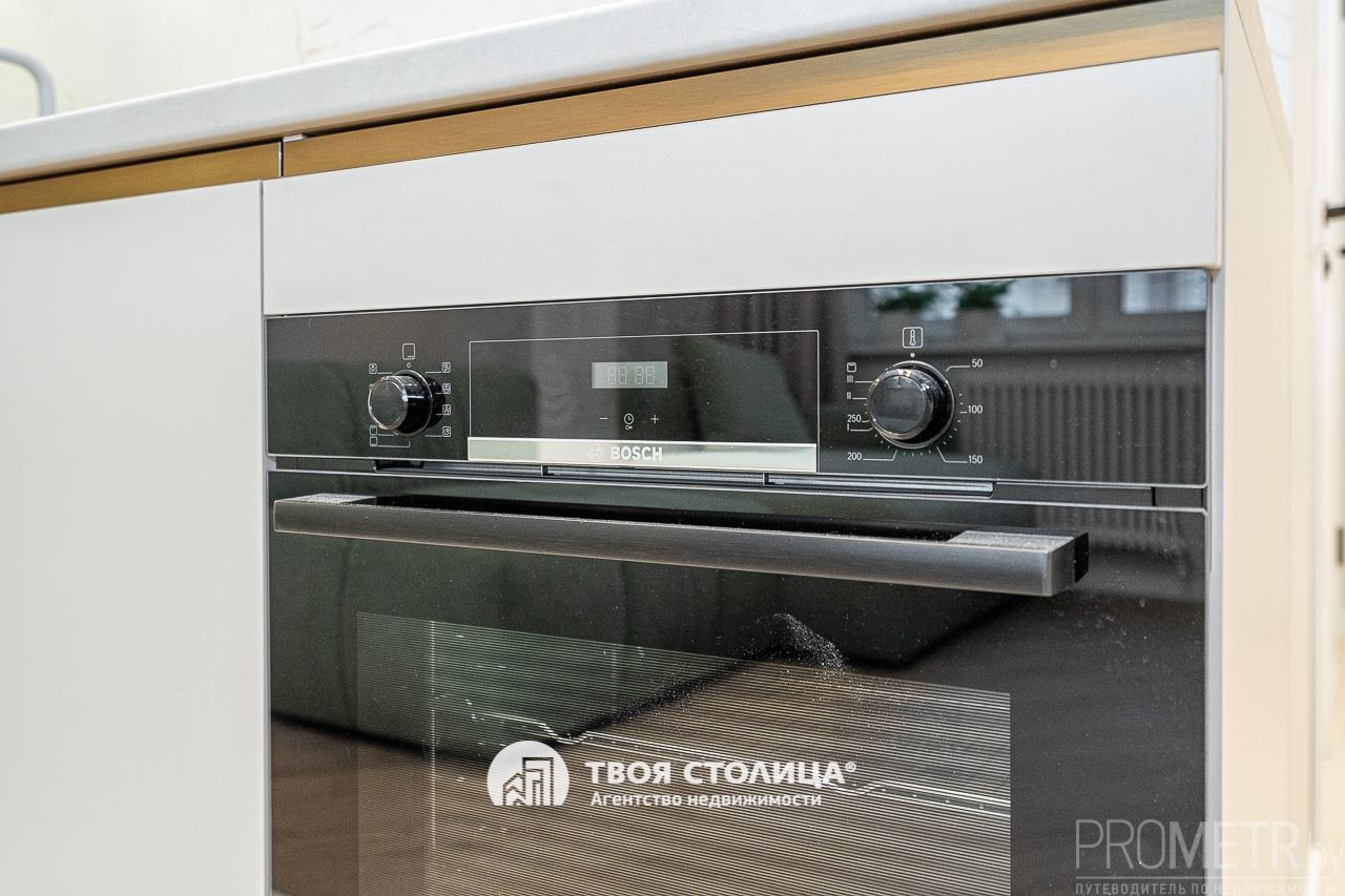 Премиальная кухня: Современная техника (посудомоечная машина, вытяжка, варочная поверхность, духовой шкаф) от ведущих брендов Bosch и Weissgauff. Особую атмосферу создает встроенная подсветка шкафчиков.