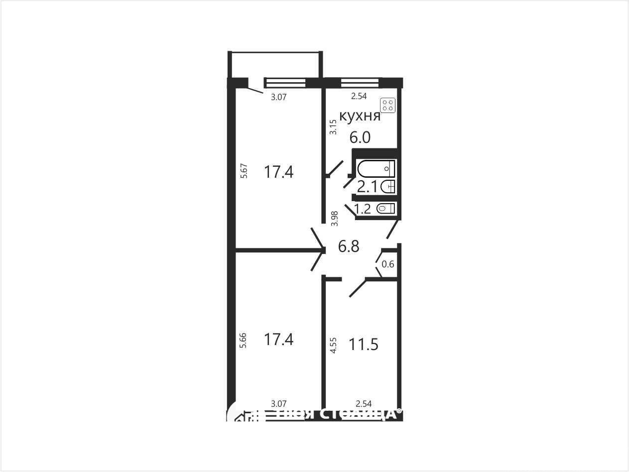Раздельные комнаты площадью 11,5 кв метров, 17,4 кв метра с вместительной кладовой (можно сделать гардеробную) с выходом на балкон и еще одна комната 17,4 кв метра.