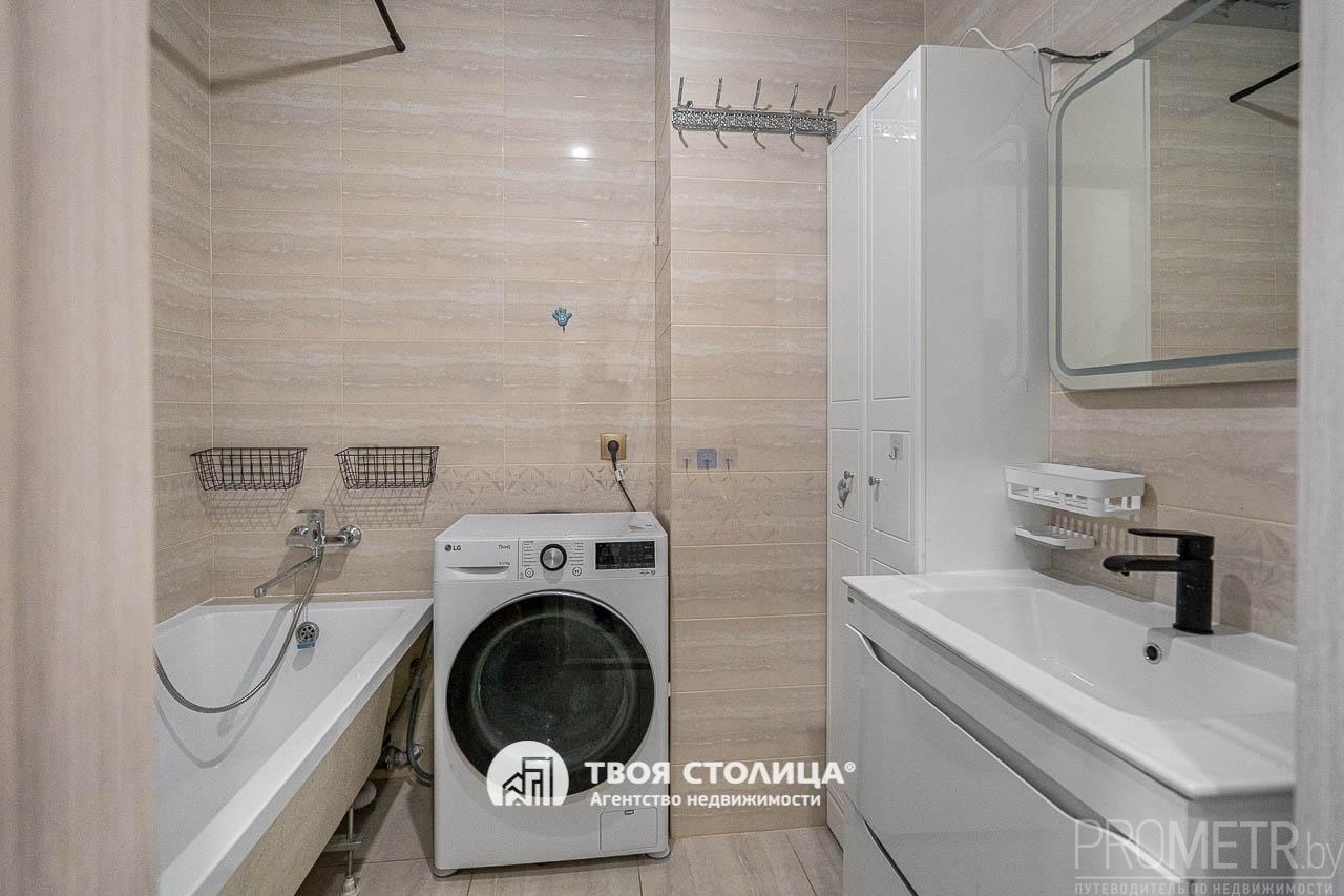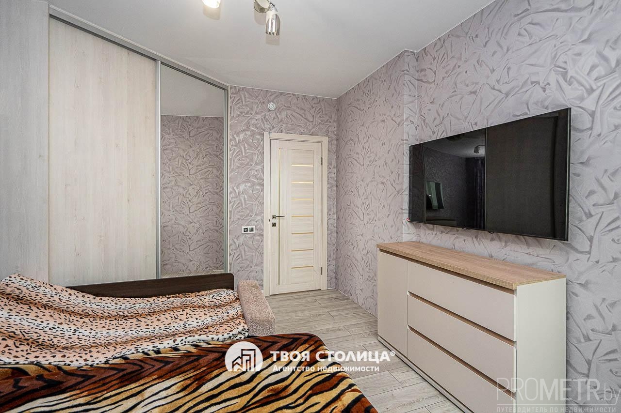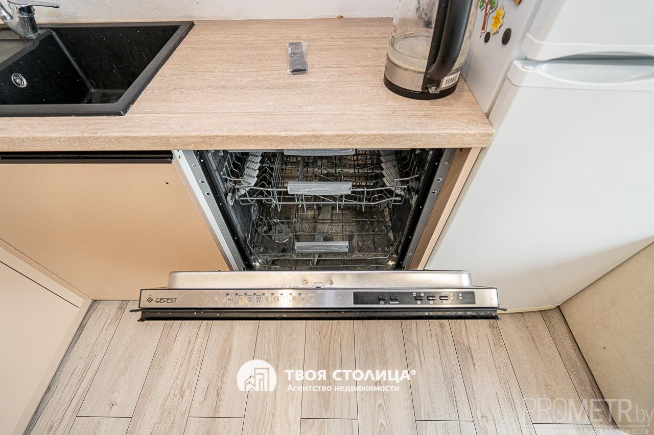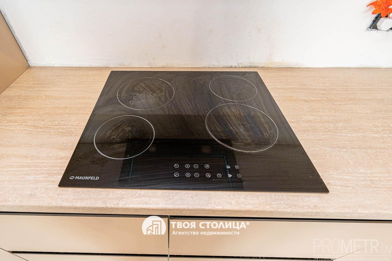 Квартира меблирована и готова к заселению. Выполнен ремонт с применением современных отделочных материалов. Натяжные потолки с точечными и подвесными осветительными приборами. Напольное покрытие: ламинат, плитка. Межкомнатные двери из МДФ, входная металлическая. Встроенная кухонная мебель с бытовой техникой импортного производства: индукционная варочная панель, духовой шкаф, вытяжка, посудомоечная машина. Оборудованы места хранения, в том числе вместительные шкафы в спальне и коридоре. В санузле плитка современного дизайна, установлена мебель для ванной комнаты, сантехническая посуда и оборудование (в том числе бойлер).