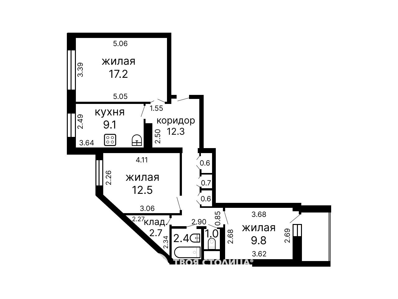 Комнаты 17,2, 12,5 и 9,8 м2.