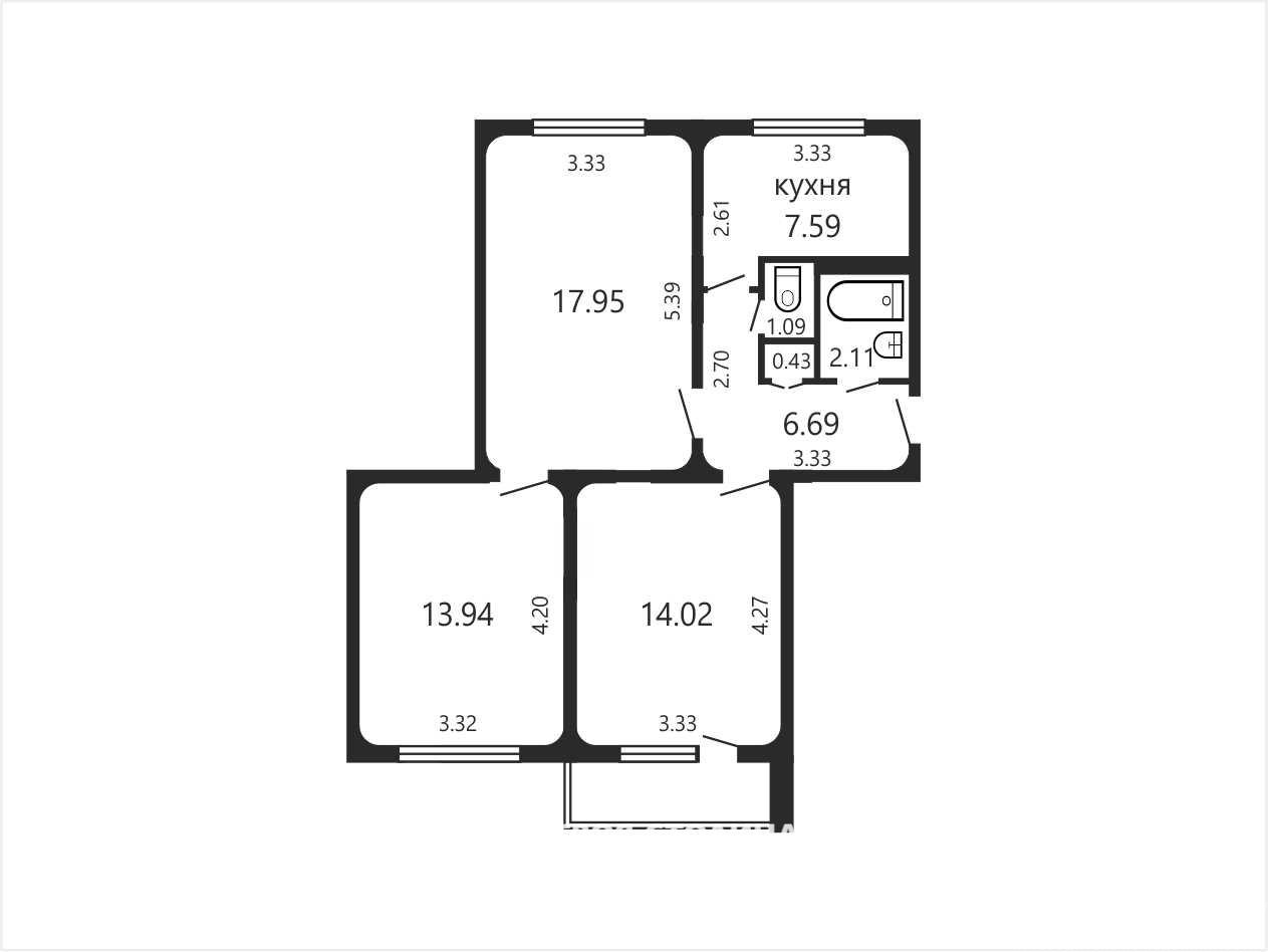 Вашему вниманию предлагается трехкомнатная квартира общей площадью 63,8 м.кв , жилая площадь – 43 м.кв., кухня – 7,59 м.кв. Две комнаты смежные, одна раздельная. Санузел раздельный.