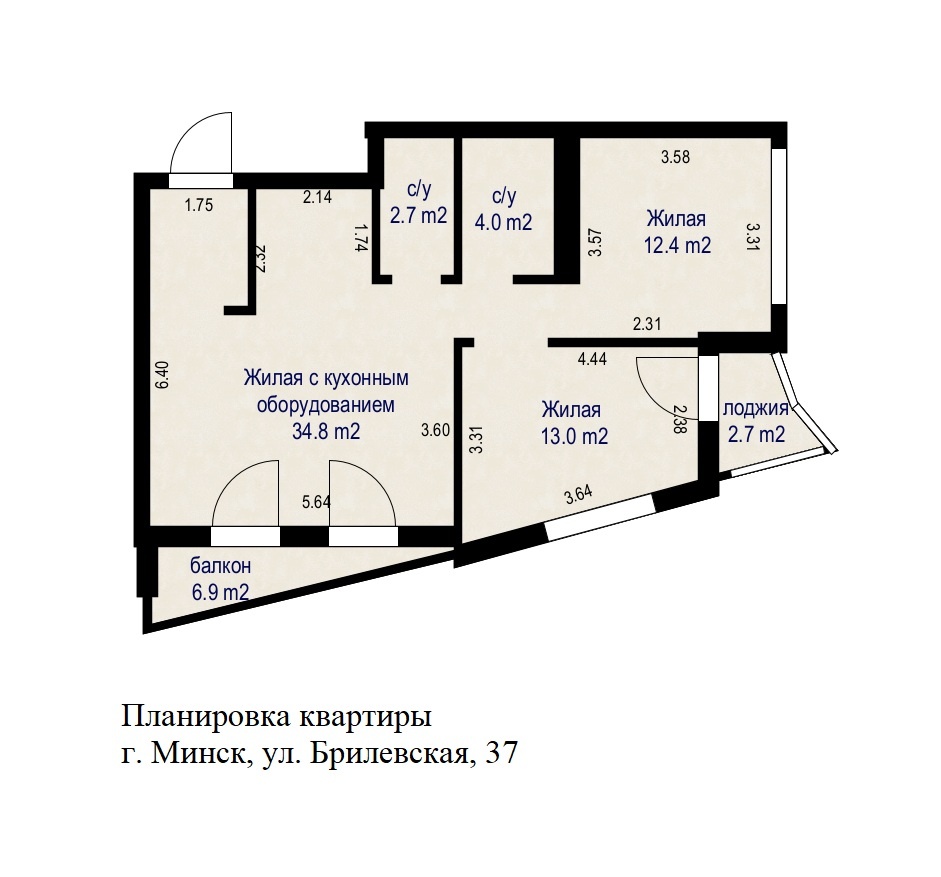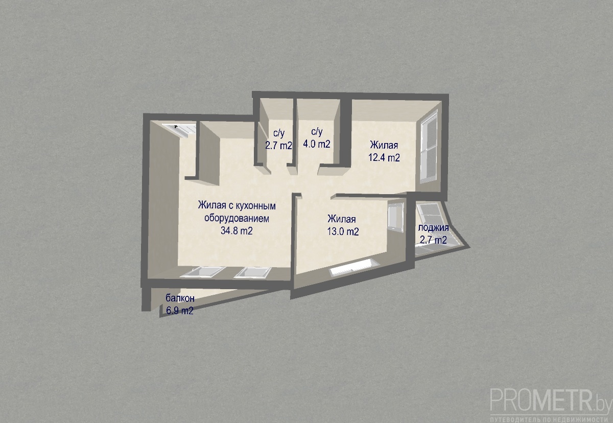 Общая площадь 66,9 кв. м., жилая площадь 60,2 кв. м., кухня-гостиная 34,8 кв. м., высота потолков 2.75 м.<br />