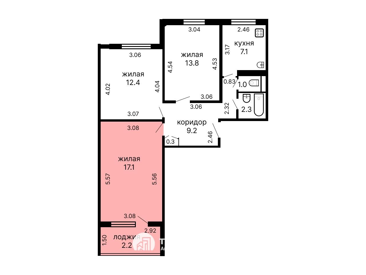 Продаётся комната 17.1м2 с лоджией в трехкомнатной квартире.