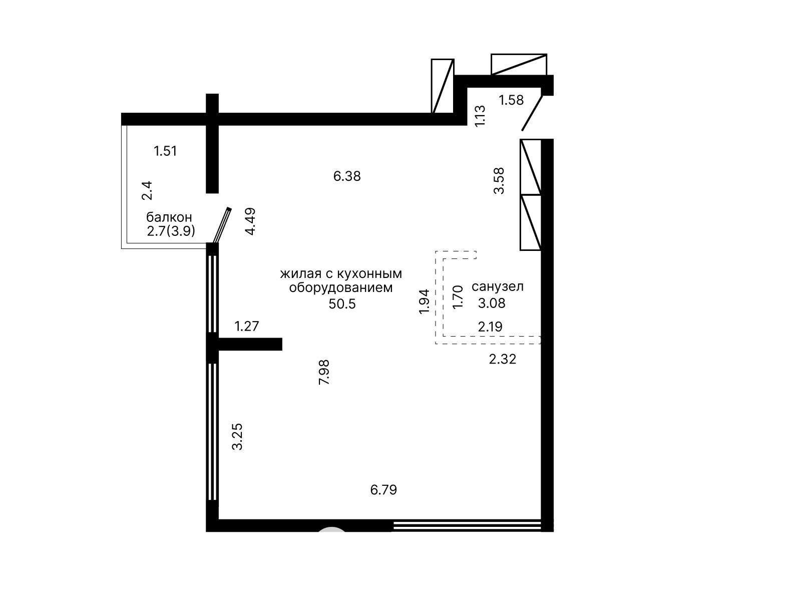 Площадь по СНБ — 57 м² Общая площадь — 54,3 м² Жилая площадь — 50 м² Высота потолков — 2,73 м