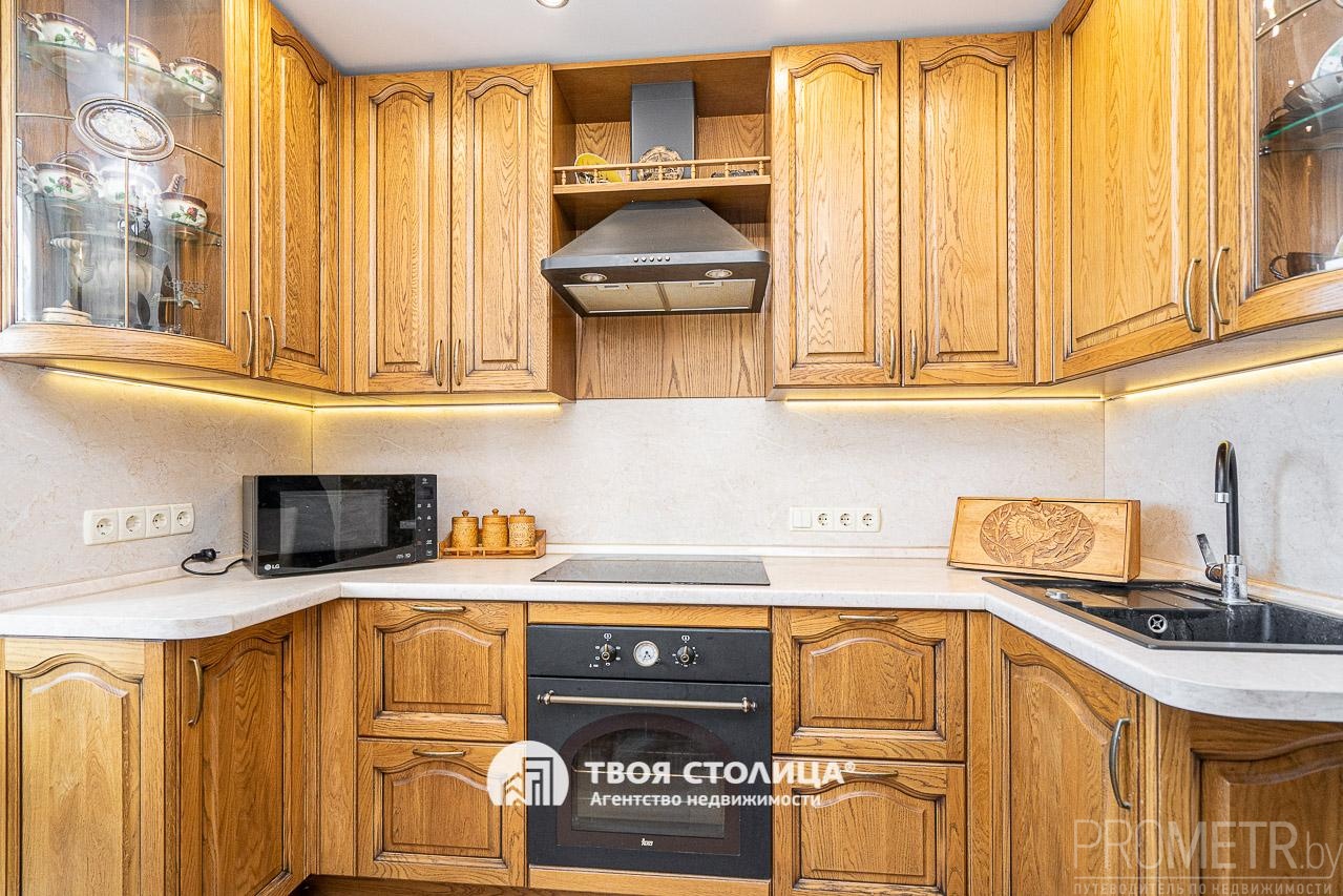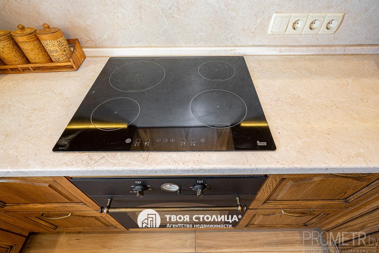Кухня из массива дуба: Выполнена в рустикальном стиле по индивидуальному заказу. Натуральное дерево, встроенная техника и уникальные люстры в виде чайного набора создают неповторимый характер и уют.