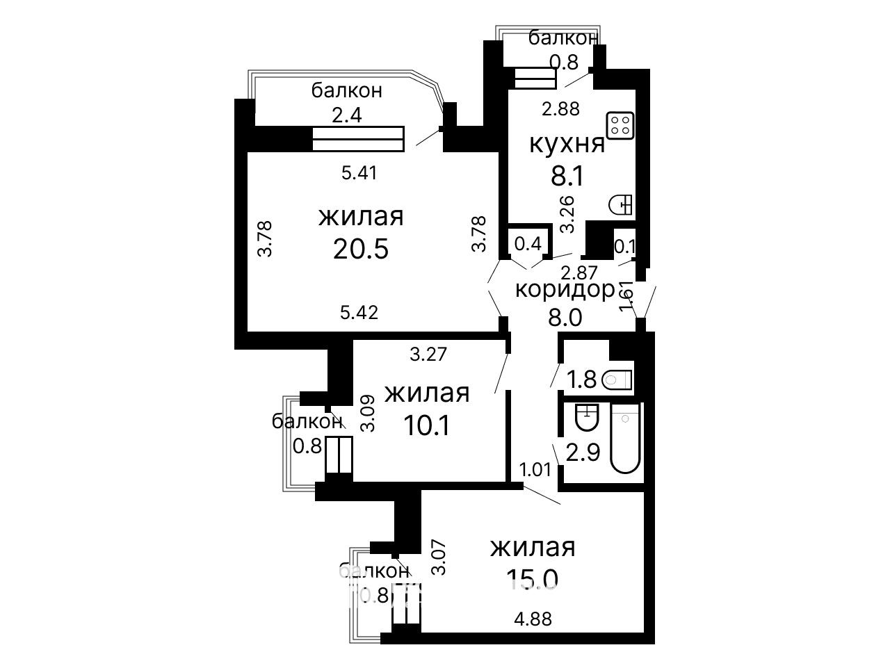 Редкое преимущество - сразу четыре застеклённых балкона.