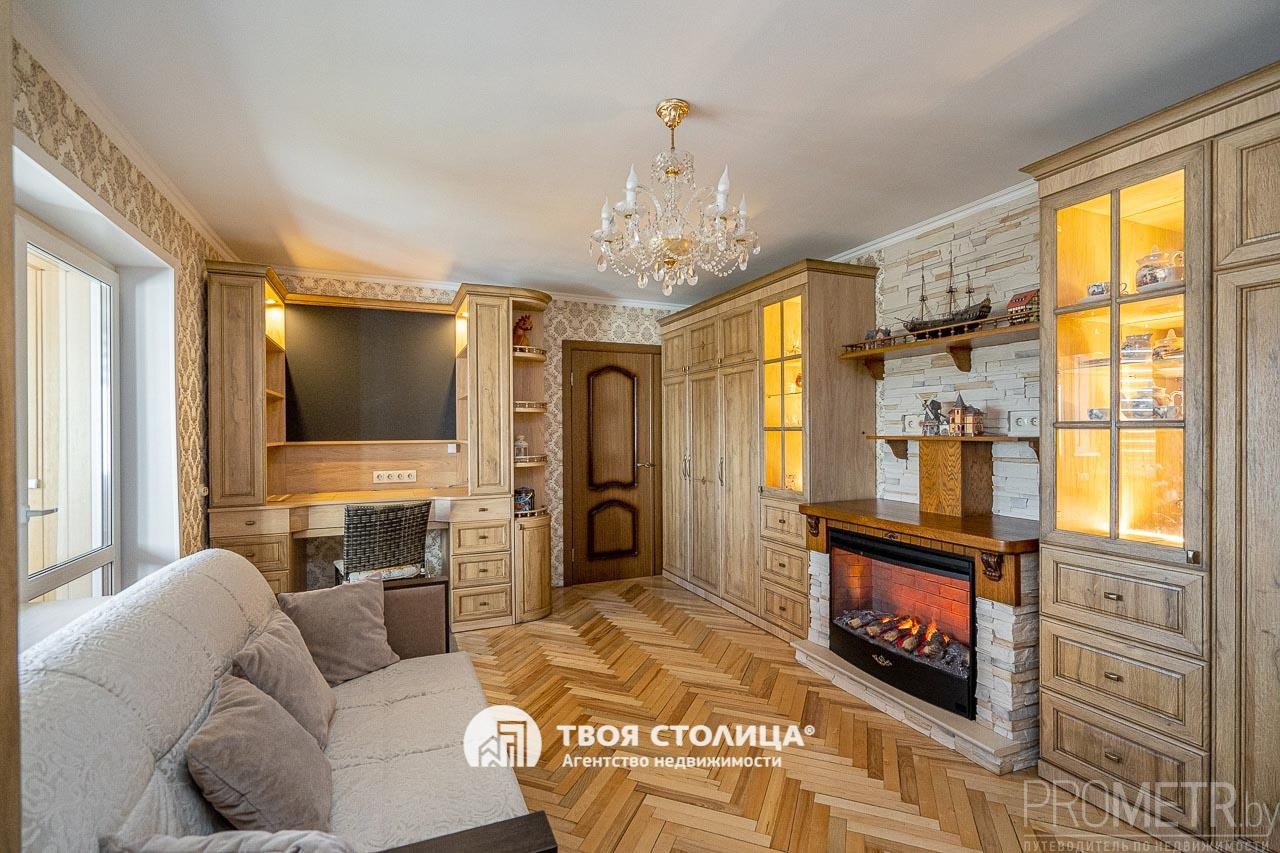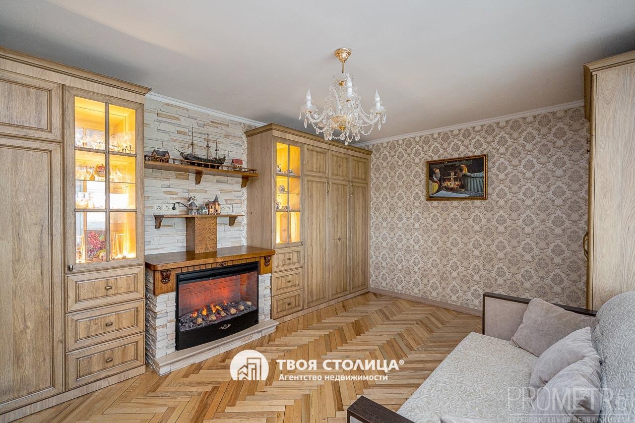 Гостиная с камином: Сердце квартиры — уютная зона отдыха с электрическим камином, создающим атмосферу загородного дома. На полу — качественный паркет, обеспечивающий тепло и долговечность.