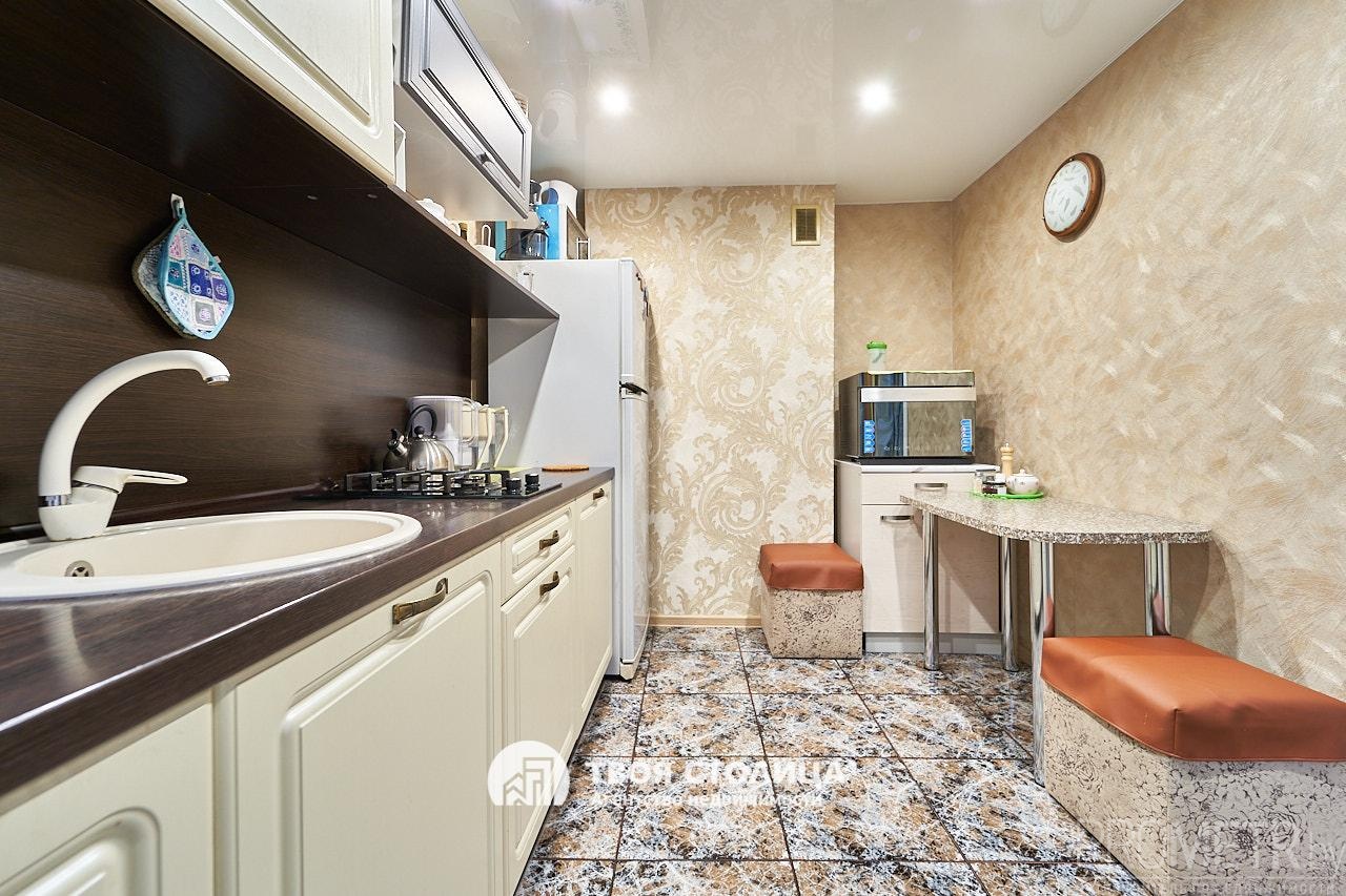 Кухня (7,9 м2) – уютная, полностью оборудована мебелью и техникой, на полу плитка.