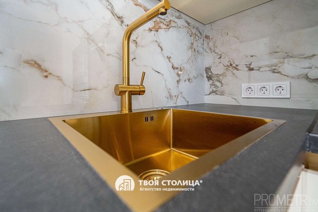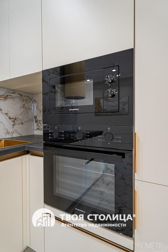 Квартира полностью укомплектована современной бытовой техникой британского бренда Maunfeld: холодильник, посудомоечная машина, духовой шкаф, СВЧ печь, варочная панель и стильная вытяжка. Премиальное сантехническое оборудование в оттенке брашированного золота. Установлена система кондиционирования для комфортного климата круглый год.