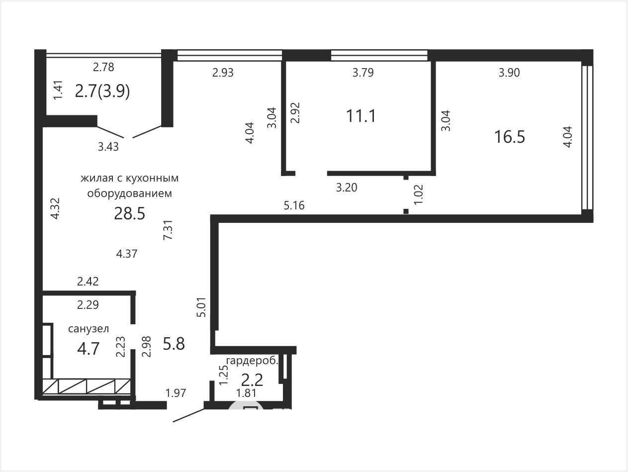 - Застекленная лоджия 3,9 м², совмещённый санузел 4,7 м²;