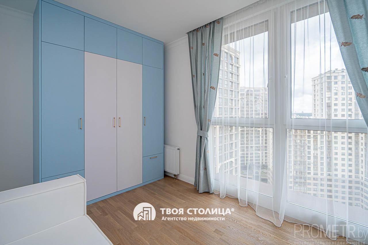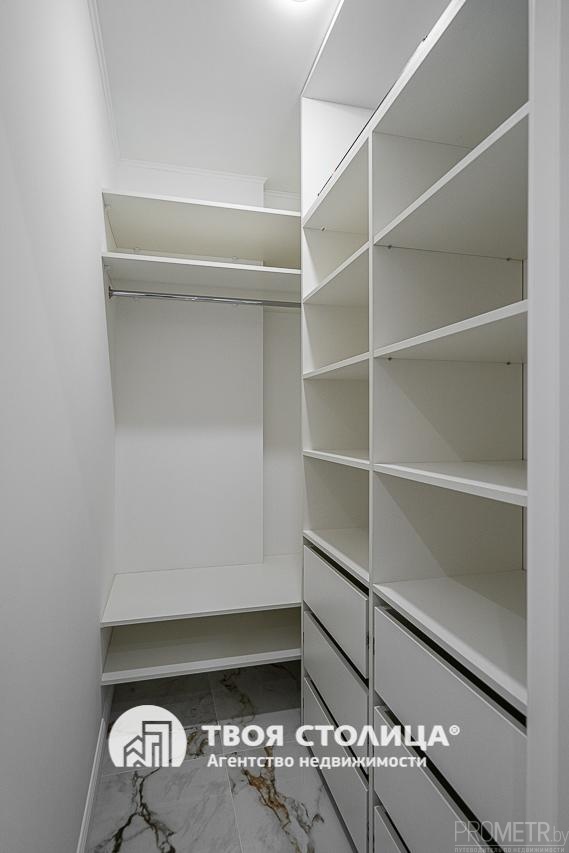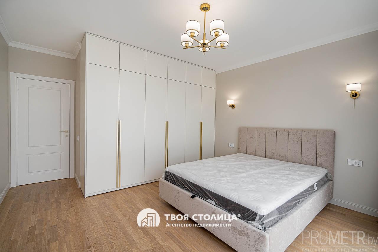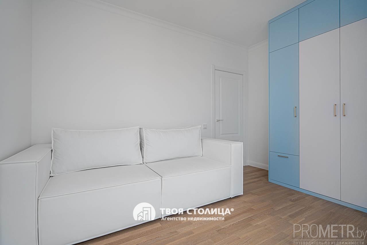 Мебель белорусского производства высокого качества продумана до мелочей — удобные системы хранения: три шкафа и полноценная гардеробная. Интерьер дополнен авторскими текстурными картинами белорусского художника и тёплыми, спокойными оттенками стен, создающими особый уют.