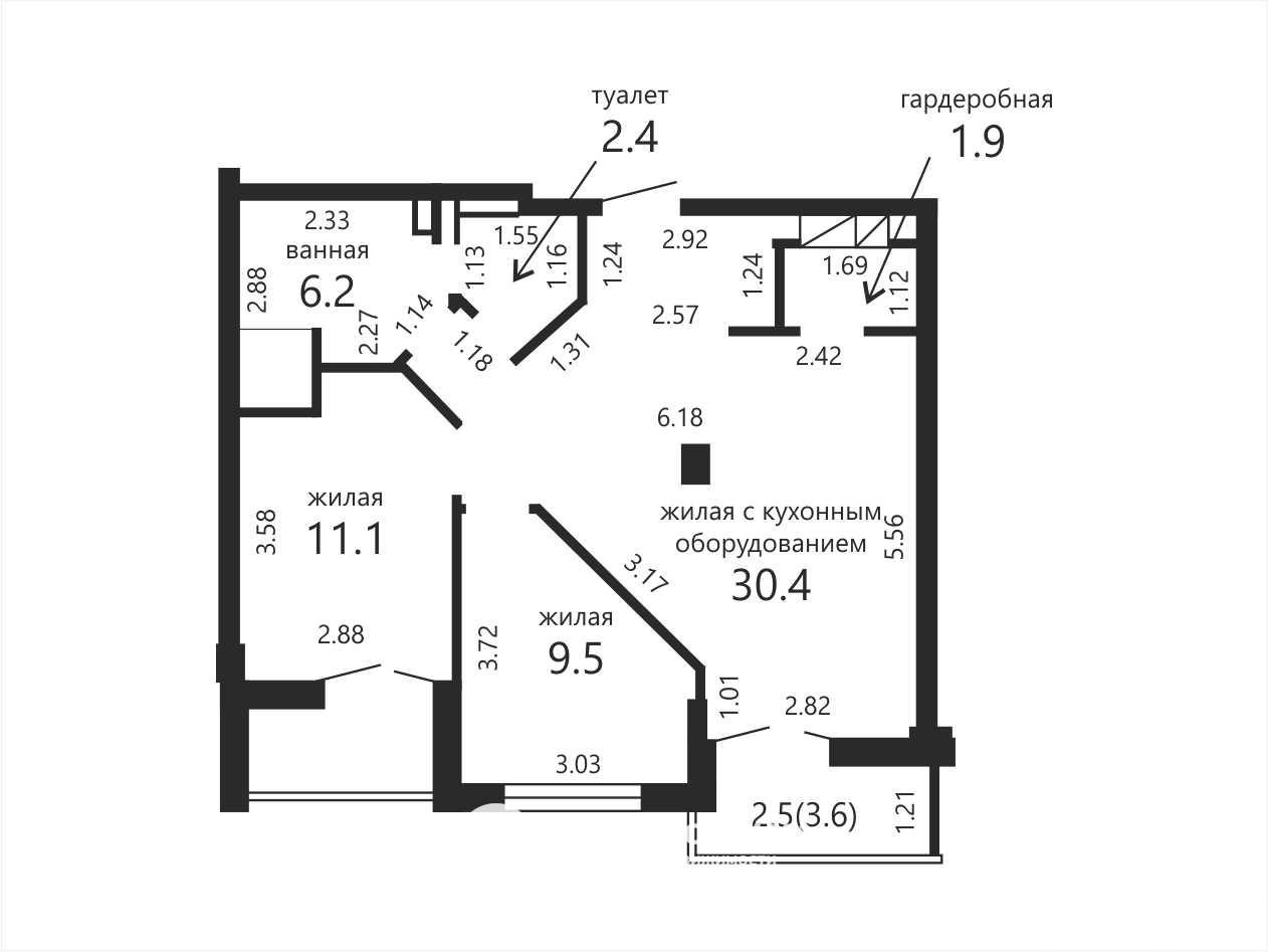 Площадь по СНБ 66 Общая площадь: 61.5. Жилая площадь: 52.9. Высота потолка: 2.75.