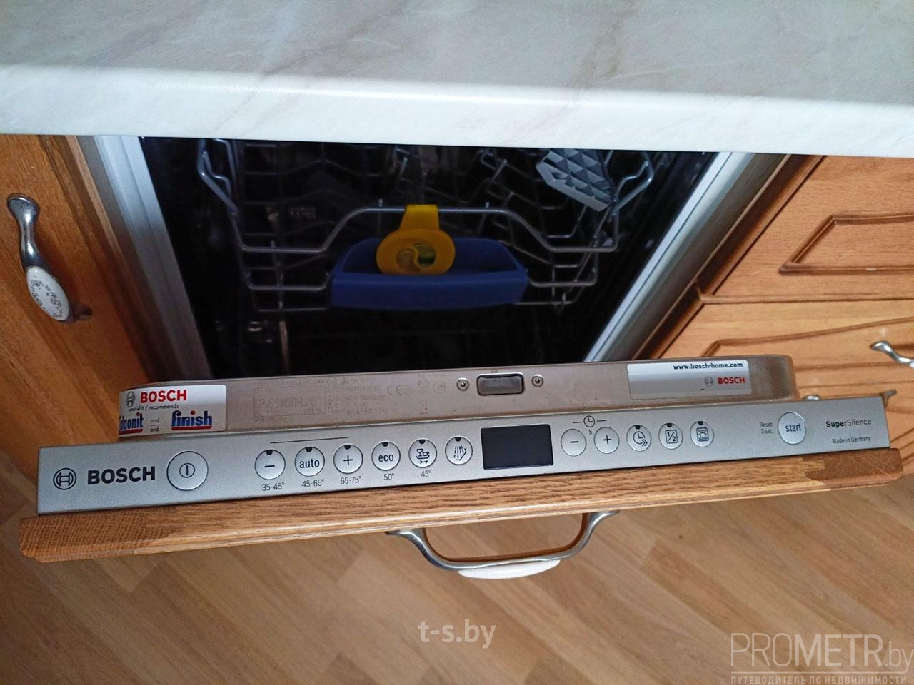 Встроенная кухня - массив дуба с бытовой техникой Bosch: варочная панель, духовой шкаф, посудомоечная машина, вытяжка.