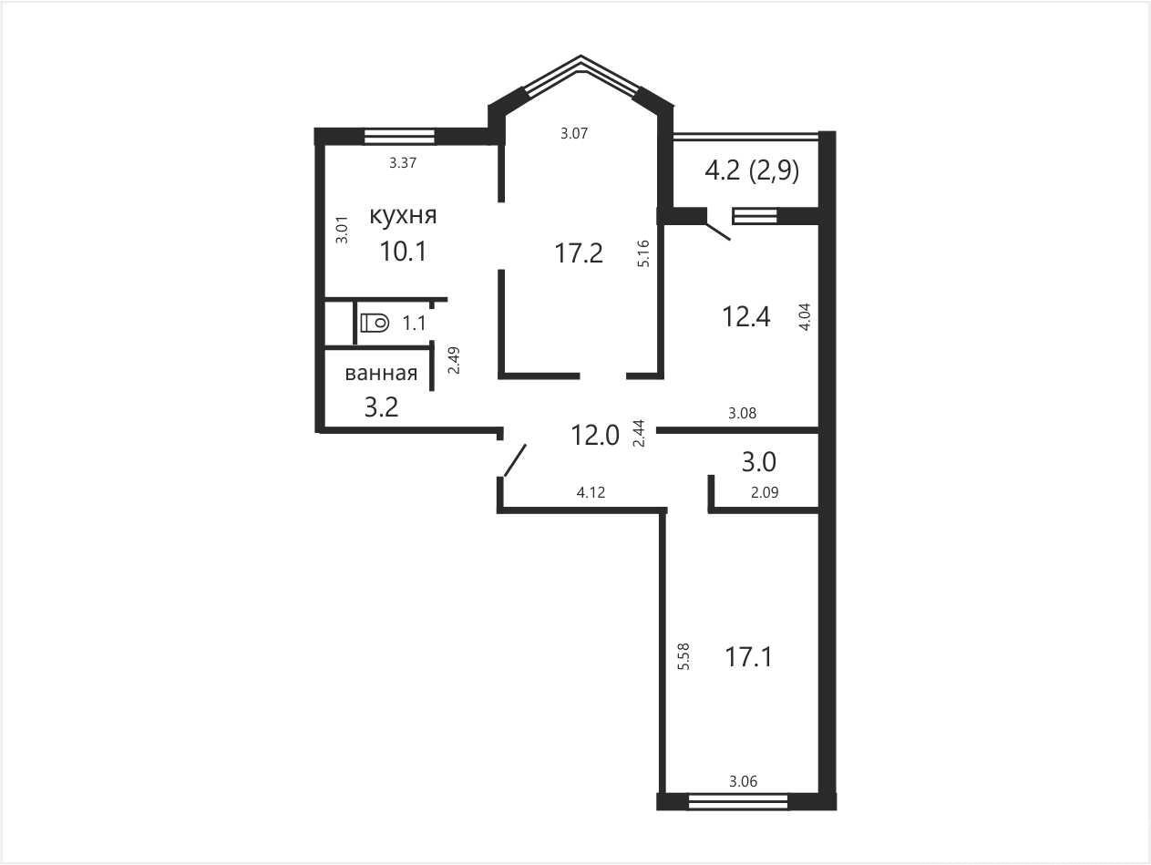 Общая площадь по СНБ:79 Общая площадь: 76.1. Жилая площадь: 46.7. Площадь кухни: 10.1. Высота потолка: 2.55.