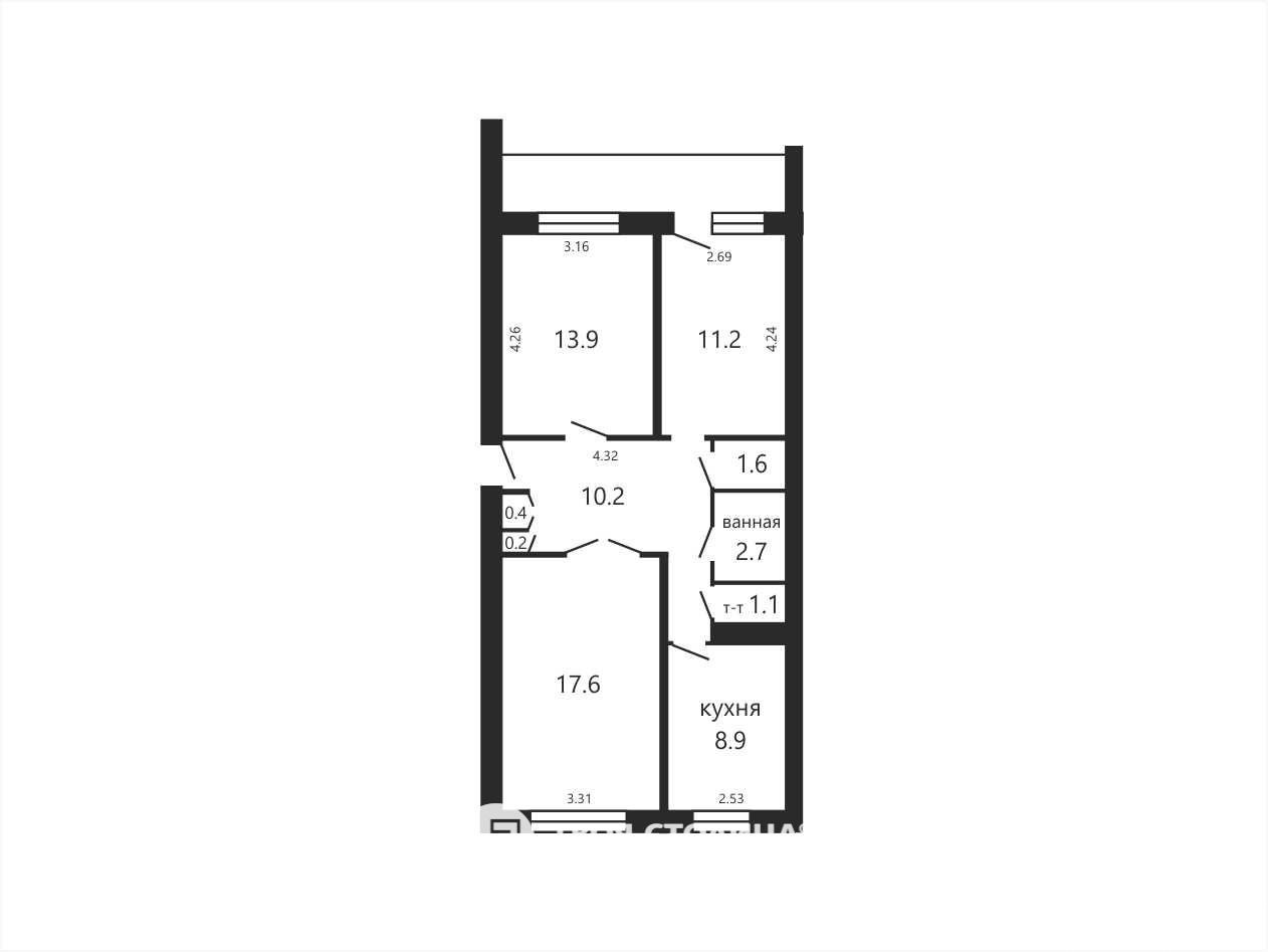 Квартира находится на 11 этаже 13-этажного кирпичного дома 1996 года постройки, что гарантирует надежность и хорошую шумоизоляцию. Общая площадь составляет 67.1 кв.м(СНБ 70.4), жилая – 42 кв.м, уютная кухня – 8.9 кв.м.