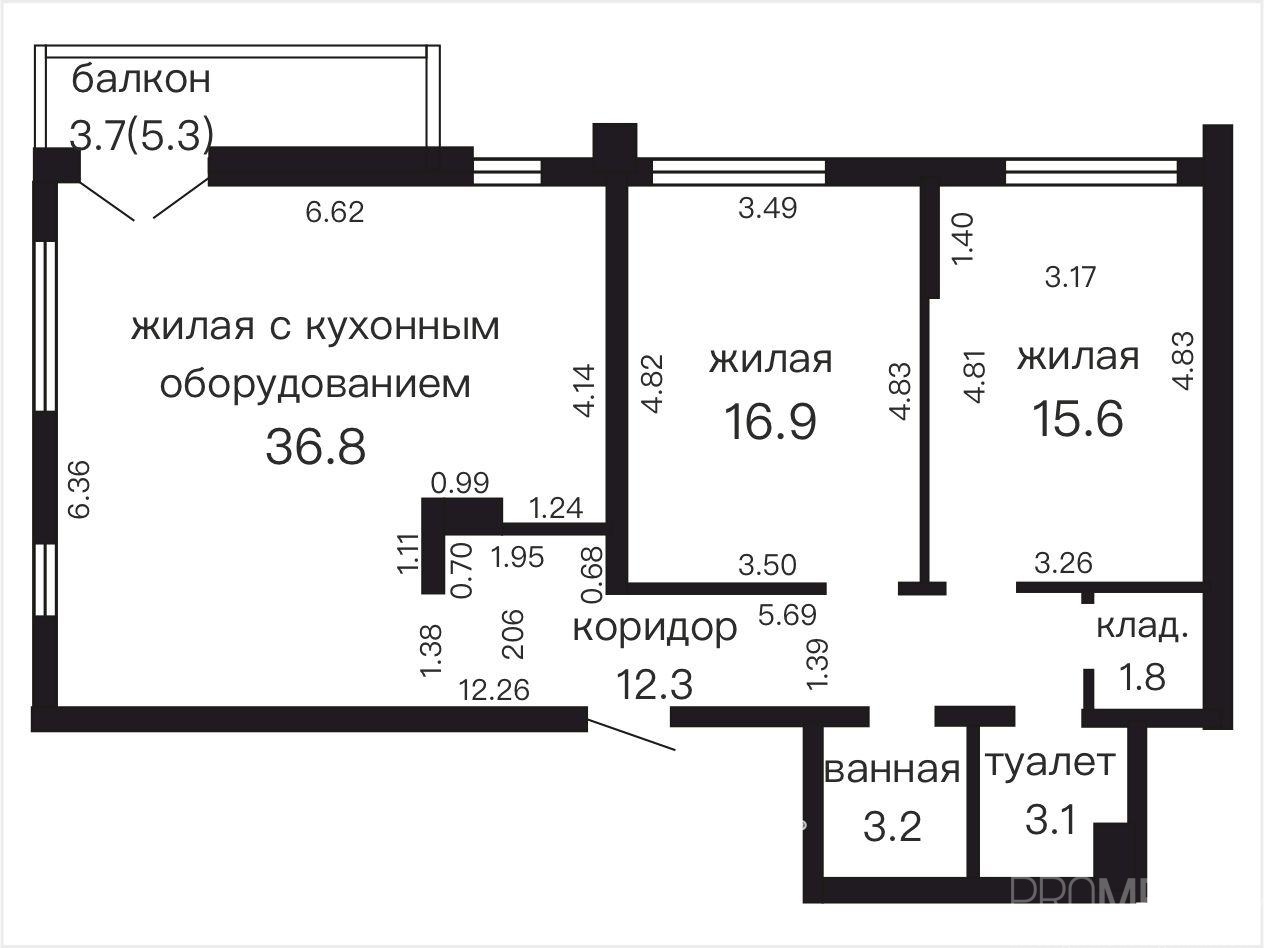 Квартира общей площадью 93.40 метра. Из них на жилую площадь отведено почти 69.30 метров. Раздельный санузел.