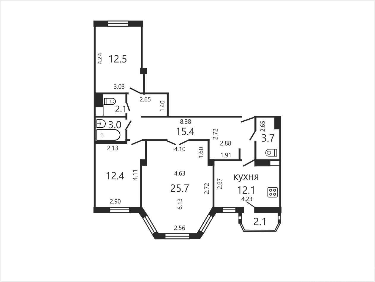 Особенностями квартиры является наличие двух санузлов, трех раздельных комнат наибольшей площадью 25,7 м², просторной кухни 12 м² с лоджией.