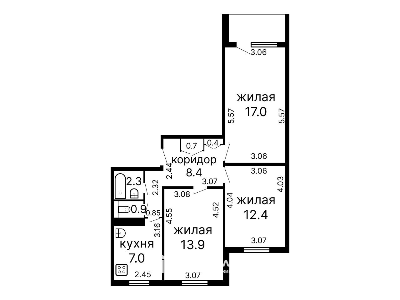 Рациональная планировка: изолированные жилые комнаты, просторный коридор, раздельный санузел. Окна выходят на разные стороны дома, что делает квартиру визуально ещё более светлой и просторной.