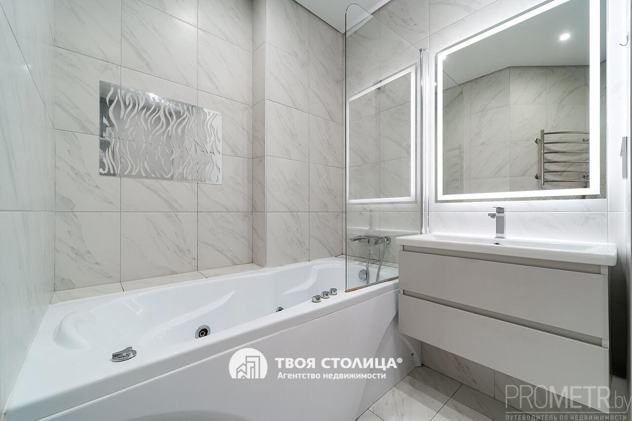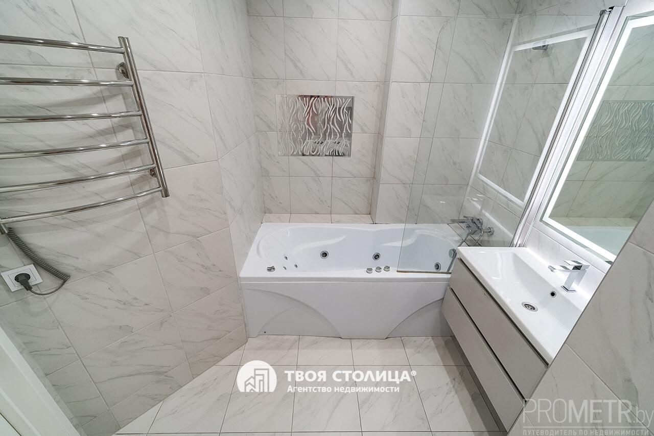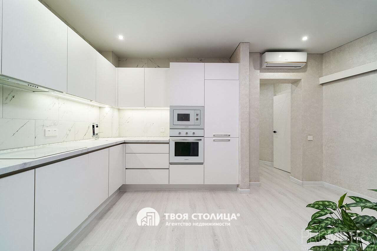 Продается полностью с мебелью, включая стильную встроенную кухню со всей необходимой бытовой техникой: варочная поверхность, вытяжка, духовой шкаф, микроволновая печь, посудомоечная машина, холодильник. Установлен кондиционер. Потолок с теневым профилем, пол - ламинат, плитка. В квартире предусмотрена вместительная гардеробная. К вашим услугам совмещенный санузел с инсталляцией и роскошной джакузи, гигиеническим душем и бойлером. Застекленные лоджия и балкон для дополнительного пространства.
