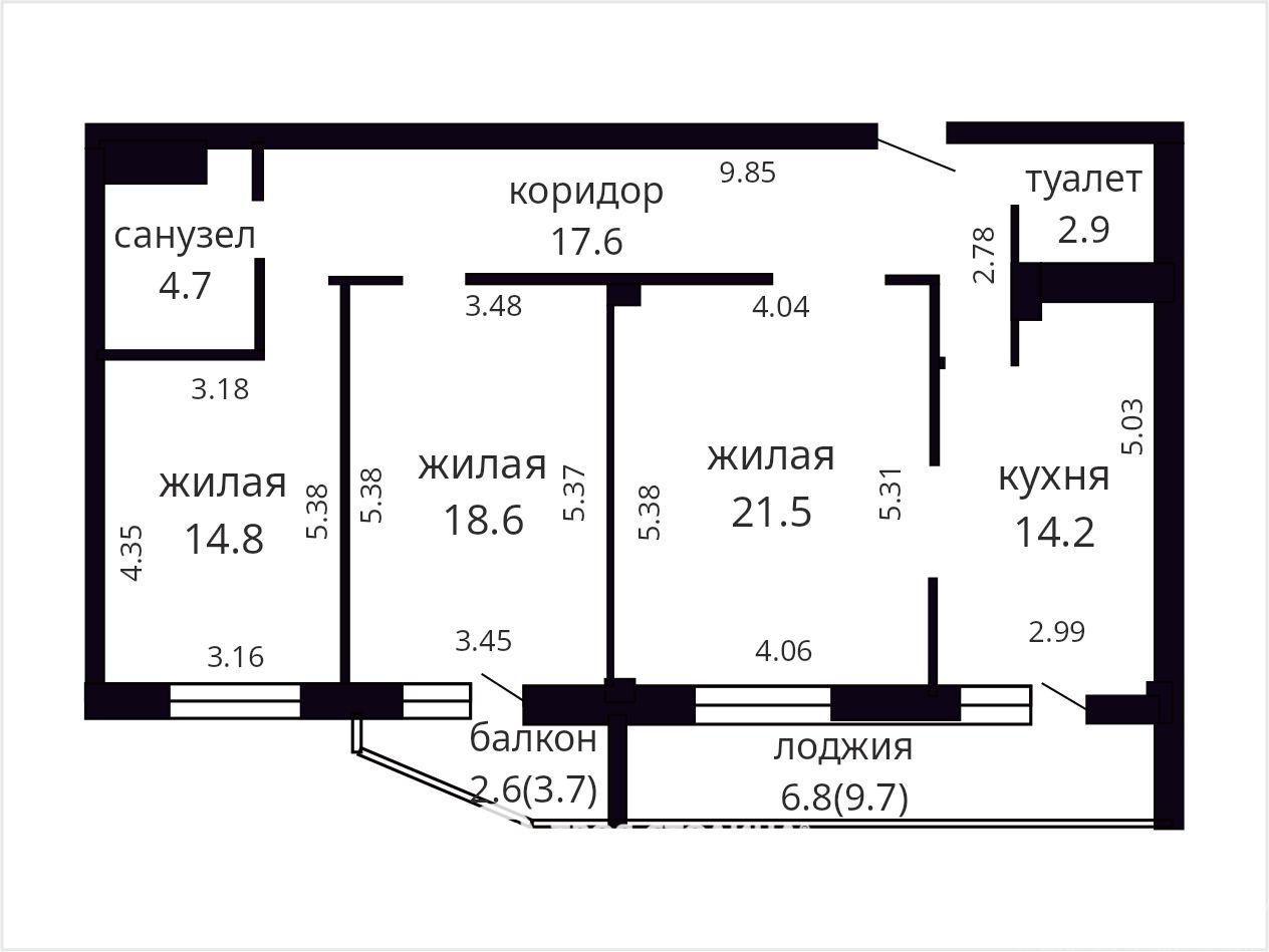 Материал стен: кирпичный. Год постройки: 2008. Этаж: 7/11, 2 лоджии Площадь по СНБ 103.7 кв.м. Общая площадь: 94.3 кв.м. Жилая площадь: 54.9 кв.м. Площадь кухни: 14.2 кв.м.. Высота потолка: 2.72 м.