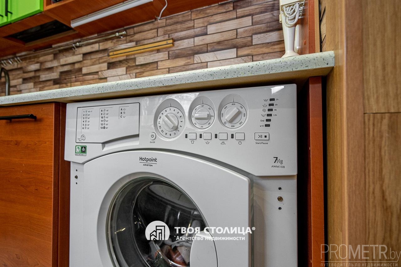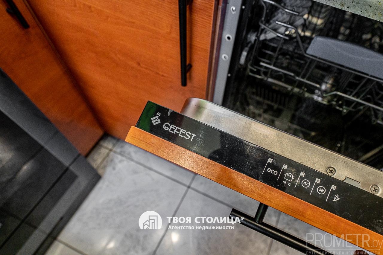 Небольшая кухня присоединена к соседней комнате в результате получилось большое пространство кухни-столовой (переоборудование квартиры узаконено в БРТИ). Кухонная мебель изготовлена на заказ, в неё встроена вся необходимая бытовая техника, а также имеется большое количество шкафов для хранения кухонных принадлежностей.
