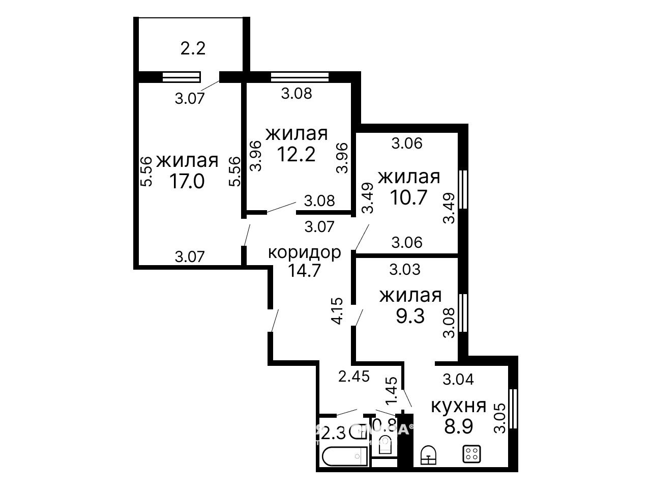 Рациональная планировка квартиры: четыре жилые комнаты, просторный коридор, раздельный санузел и вместительная кухня.